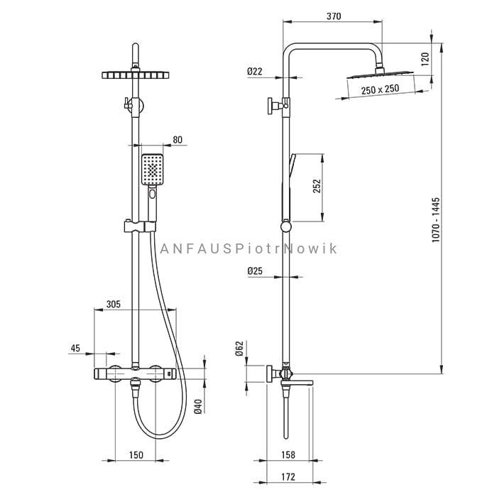 - kształt natrysku: kwadrat